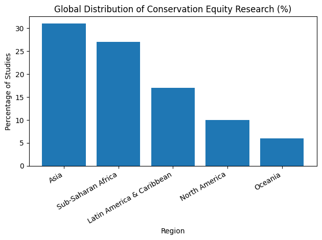 Additionally, much of the current research on equitable conservation practices focuses on Africa and Asia, about 60%24. Research show that that conservation equity research is concentrated in these regions, because they contain a high density of protected areas, both terrestrial25 and marine26. Additionally, conservations here is more immediately influenced by global edicts, such as the Convention on Biological Diversity27 (See more details listed below in Figure 1). Lastly, work and expectations are shaped by international funding, which generates built-in evaluation requirements for equity28. A funding dashboard developed by the Pew Charitable Trust, shows that between 2014 and 2024, $7.9B in international funding supported protected and conserved areas across 132 countries, through 3,225 activities reported by 110 organizations29 Conservation interventions in these regions frequently intersect with livelihoods30, land tenure31, Indigenous and local rights32, and historical governance inequities33, making questions of fairness, participation, and benefit distribution especially visible and researchable.